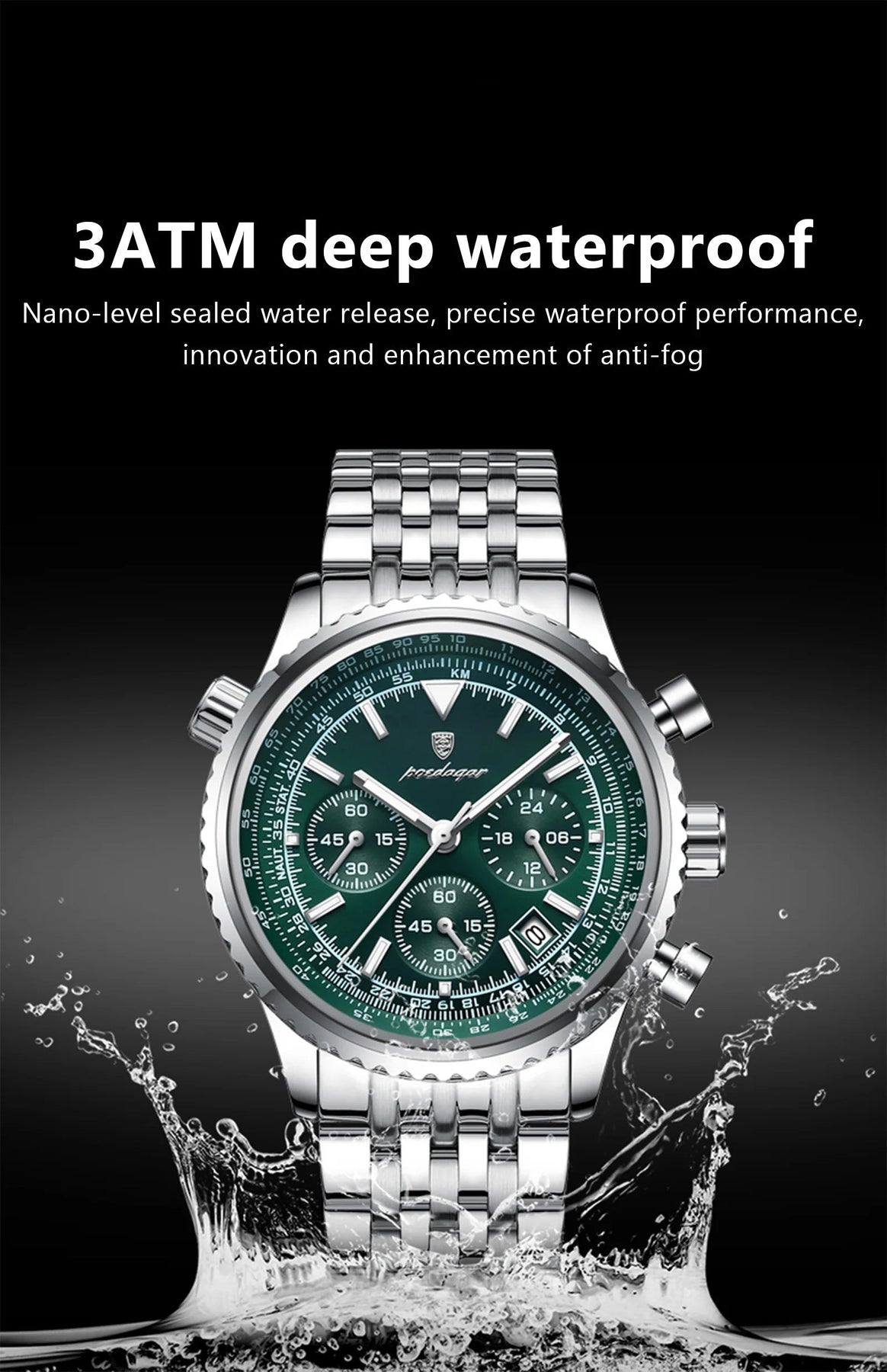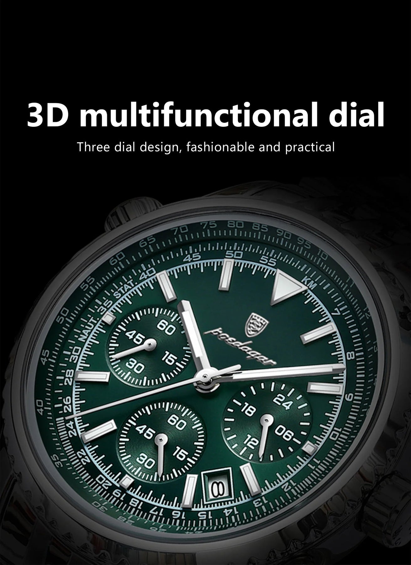 At the center is abold stainless stell wristwatch with a striking blue dail detailed sub dials and a polished metal bracelet crafield to add sophistication to any outfit